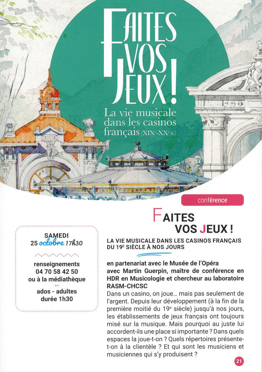 Dans un Casino, on joue… mais pas seulement de l’argent. Depuis le début de leur développement en France, à la fin de la première moitié du XIXe siècle, les établissements de jeux français ont toujours misé sur la musique. Mais pourquoi au juste lui accordent-ils une place si importante ? Dans quels espaces la joue-t-on ? Quels répertoires présentent-on à la clientèle ? Et qui sont les musiciens et musiciennes qui s’y produisent.