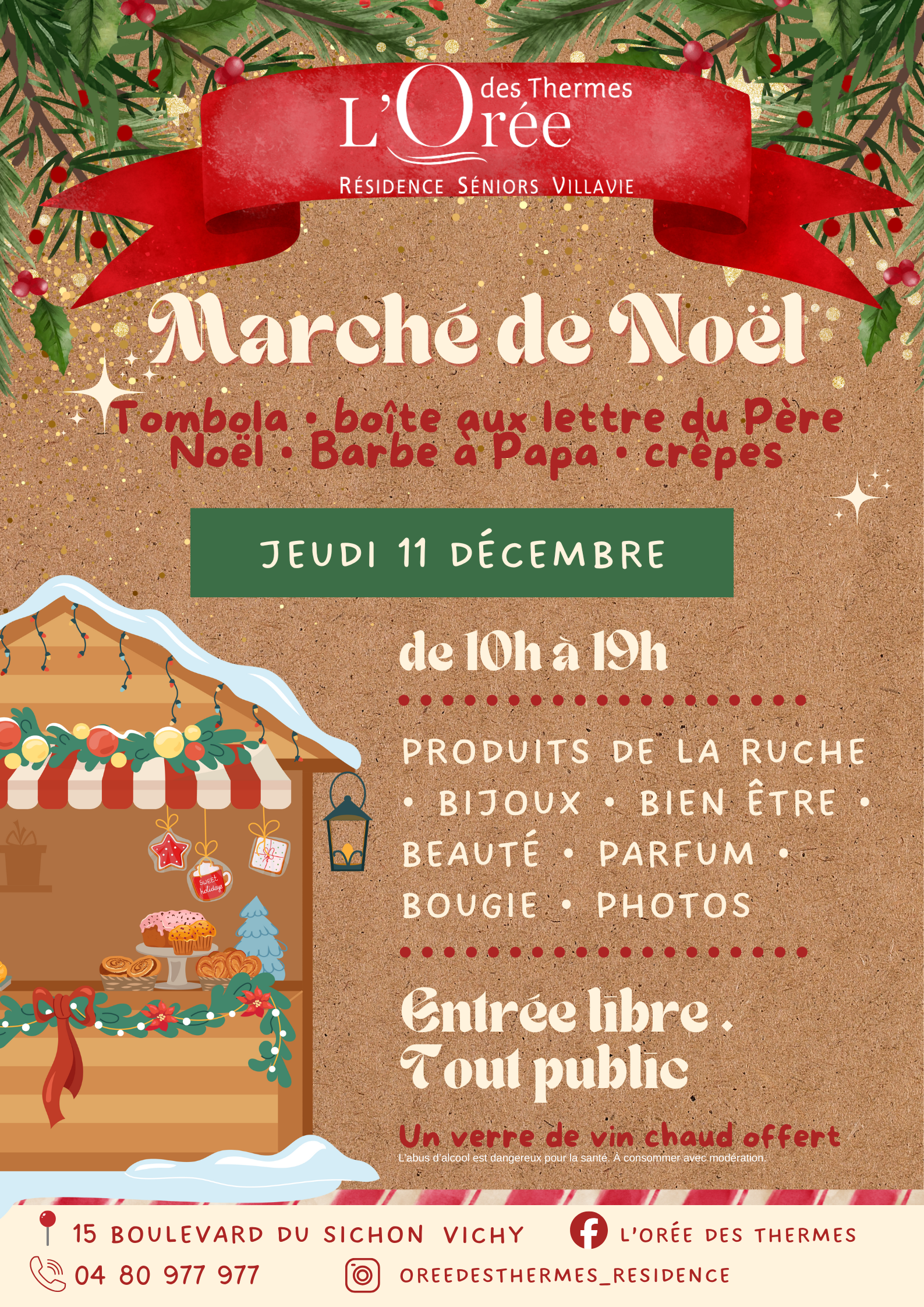 Marché de Noël avec stand tombola, boite aux lettres du Père Noël., barbe à papa, crêpes et vin chaud.