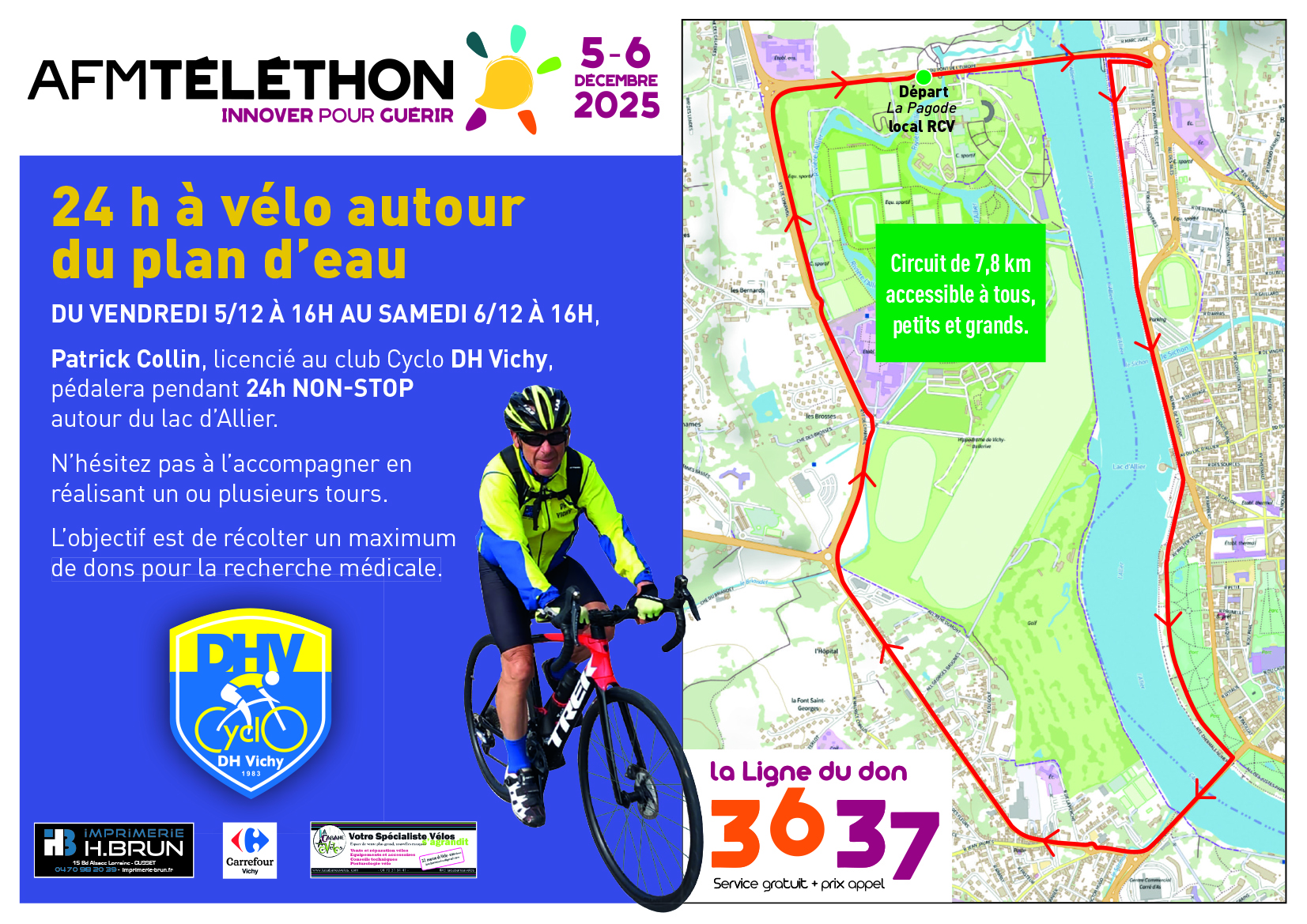 Patrick Collin, cyclotouriste du DHVichy, tournera autour du plan d'eau pendant 24H. Chacun pourra l'accompagner sur 1 ou plusieurs tours.