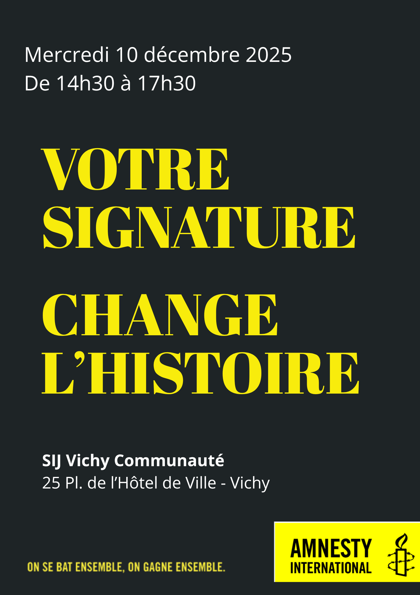 Amnesty international de Vichy sera présente sur la journée des droits de l'Homme pour recueillir votre soutien en signant la pétition en ligne dans les locaux de la Sij Vichy communauté.