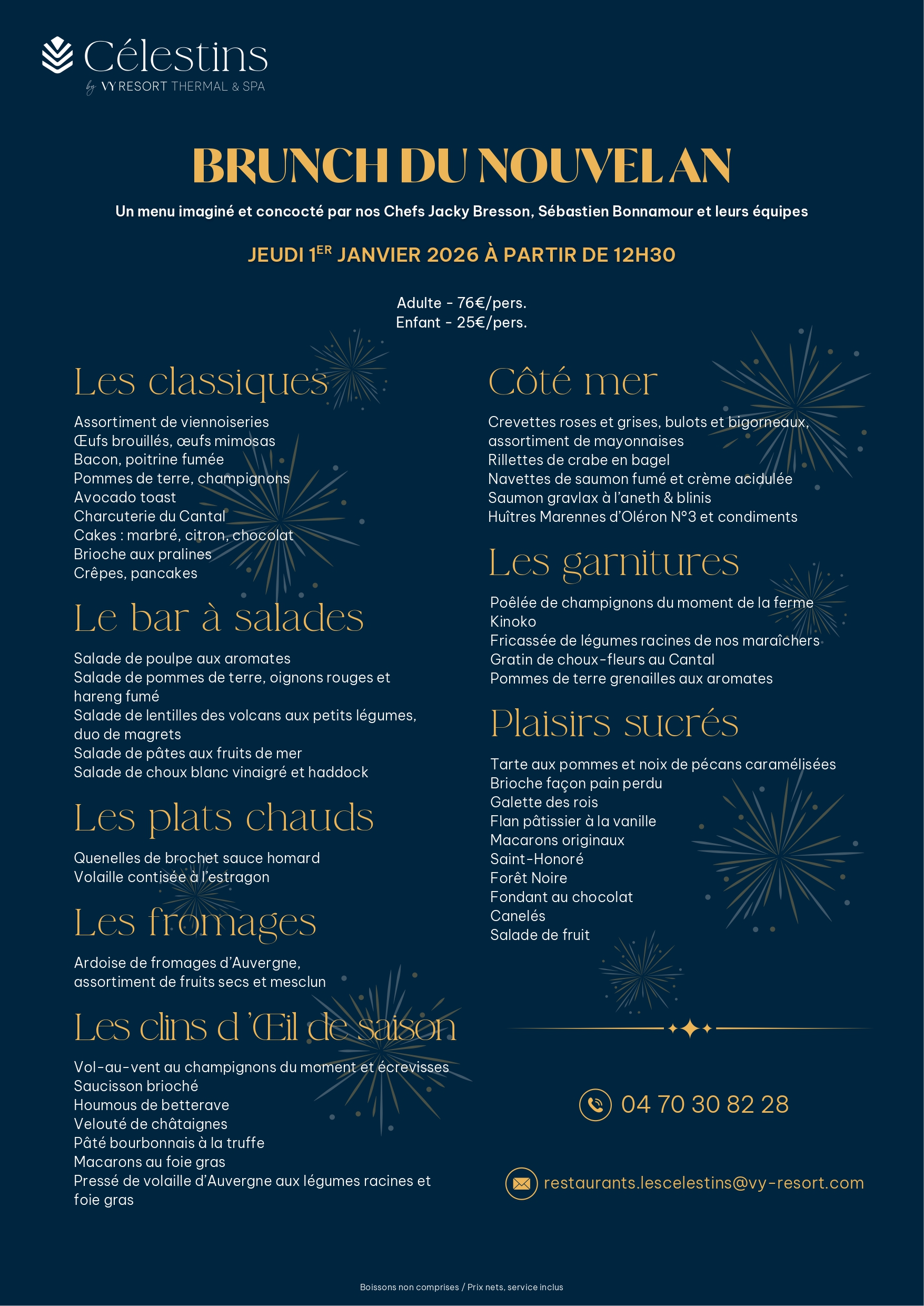 Commencez l’année en douceur avec notre Brunch du 1er janvier. Un buffet généreux, des produits frais, des saveurs chaleureuses et une ambiance conviviale pour débuter 2026. Prolongez les festivités autour d’un moment gourmand et raffiné.