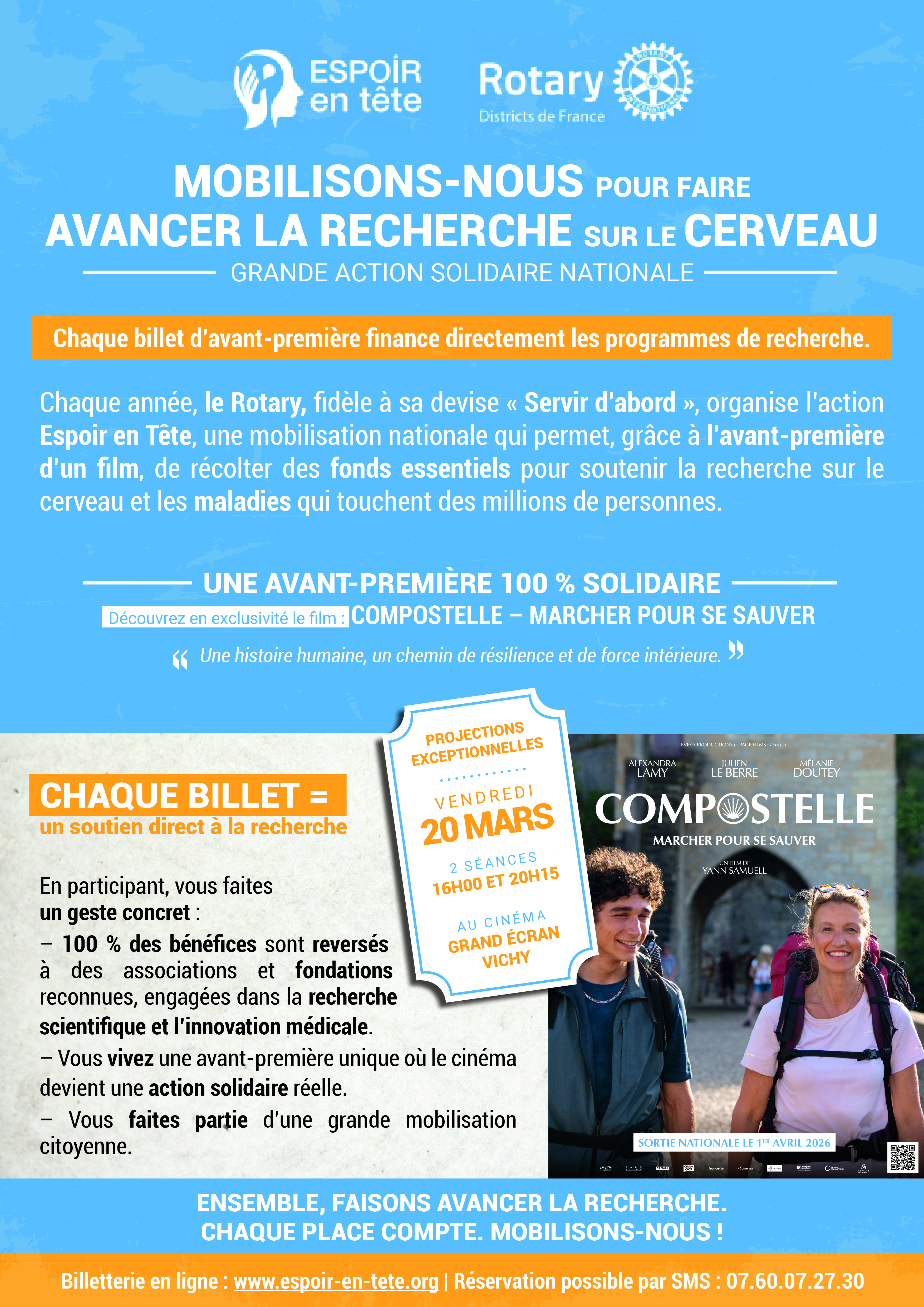 Chaque année, le Rotary organise l’action Espoir en Tête, une mobilisation nationale qui permet, grâce à l’avant-première d’un film, de récolter des fonds pour soutenir la recherche sur le cerveau et les maladies qui touchent des millions de personnes.