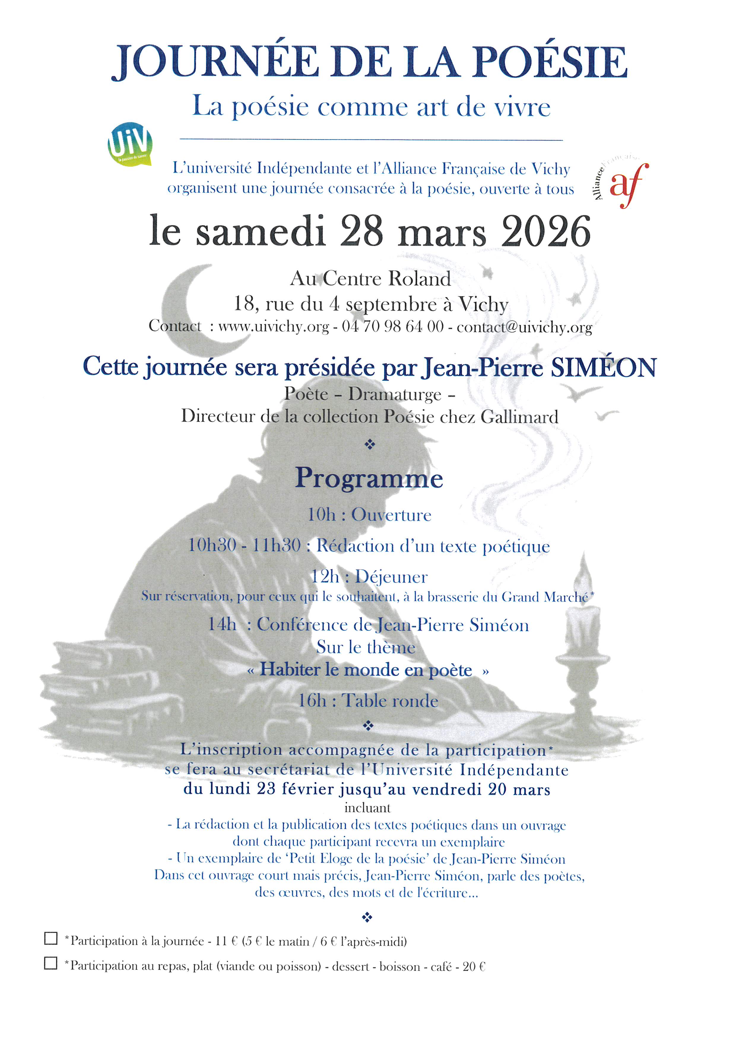 Journée de la poésie organisée par L'Université Indépendante de Vichy et l'Alliance Française et présidée par Jean-Pierre Siméon, poète, dramaturge, Directeur de la collection Poésie chez Gallimard.