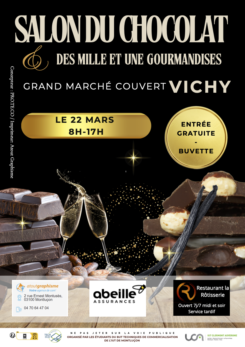 Les étudiants de l'IUT de Montluçon organisent la deuxième édition du Salon du Chocolat à Vichy. Situé à l'étage du Grand marché couvert de Vichy. Nous souhaitons mettre en valeurs et faire connaitre les artisans du terroir afin de passer un dimanche sous le signe de la gourmandise. Nous attendons environ 2000 personnes pour notre événements et nous avons 11 exposants de divers produits du terroirs.